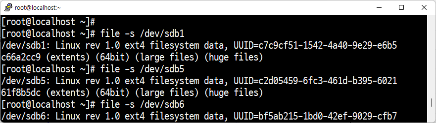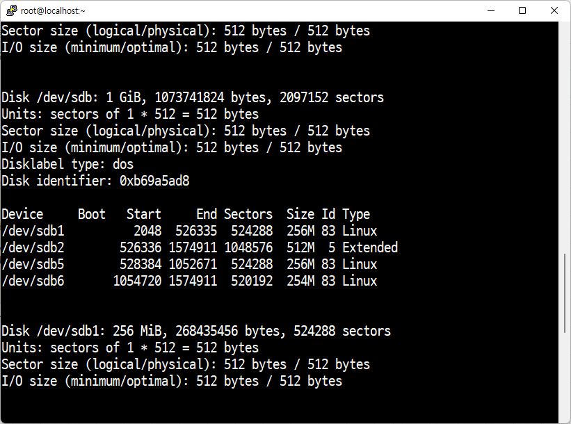 현재 세 개의 파티션(/dev/sdb1, /dev/sdb5, /dev/sdb6) 을