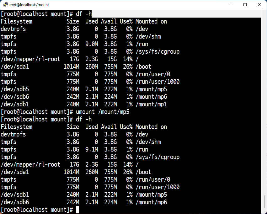 #unmount의 경우 장치가 사용중이라면 종료하고 진행하여야한다.(실행된 user의 홈 디렉토리처럼)