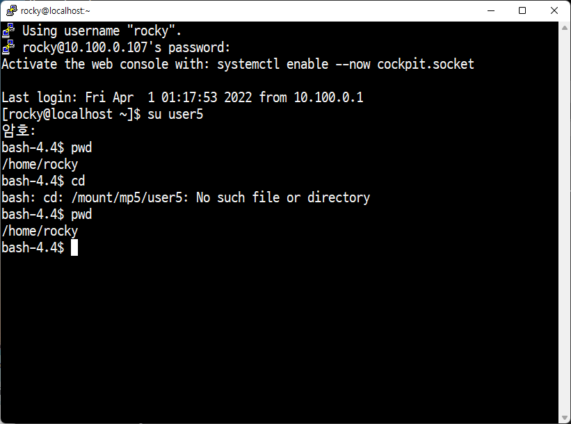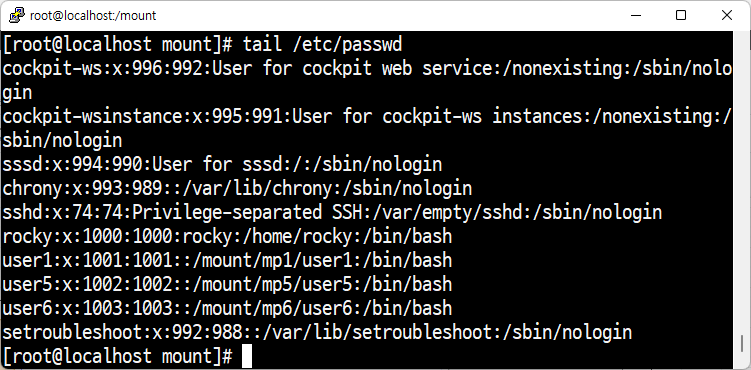 - 홈디렉토리 마운트 명령어 : usermod -d [디렉토리] [User]